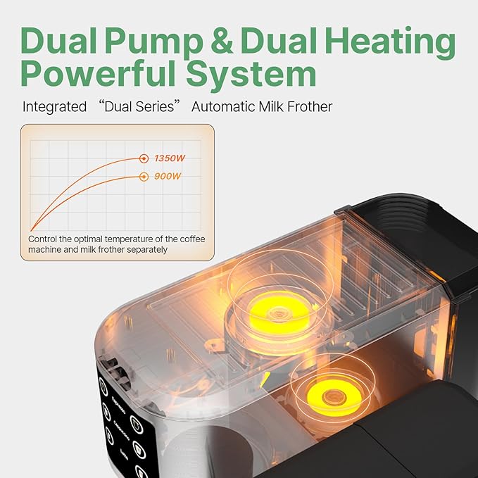- 20 Bar Professional High Pressure & Dual Heating System: Our coffee maker is equipped with 20 bar pump for espresso extraction and 4 bar pump for the milk frothing, creating the golden crema of espresso and rich milk foam. The 1350W and 900W dual fast heating systems allow the coffee machine to preheat in minutes and control the temperatures of coffee and milk froth separately. Furthermore, our cappuccino machines for home use pre-soaking technology to achieve thorough coffee penetration and enhance the taste of coffee