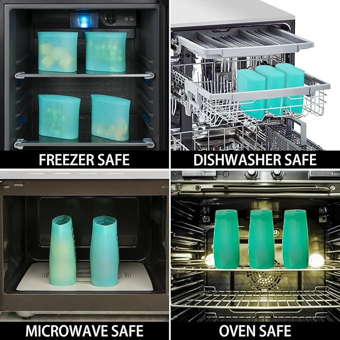 - 【DISHWASHER FREEZER MICROWAVE OVEN SAFE】Tired of dealing with plastic bags?(PEVA is actually a type of plastic.) Switch to silicone bags reusable storage and spend less time worrying about saving leftovers safely. These reusable bags are non-toxic and safe for use in the Microwave, Freezer, Oven and Dishwasher. They can even withstand temperatures up to 428℉, making them ideal for all your food storage needs
