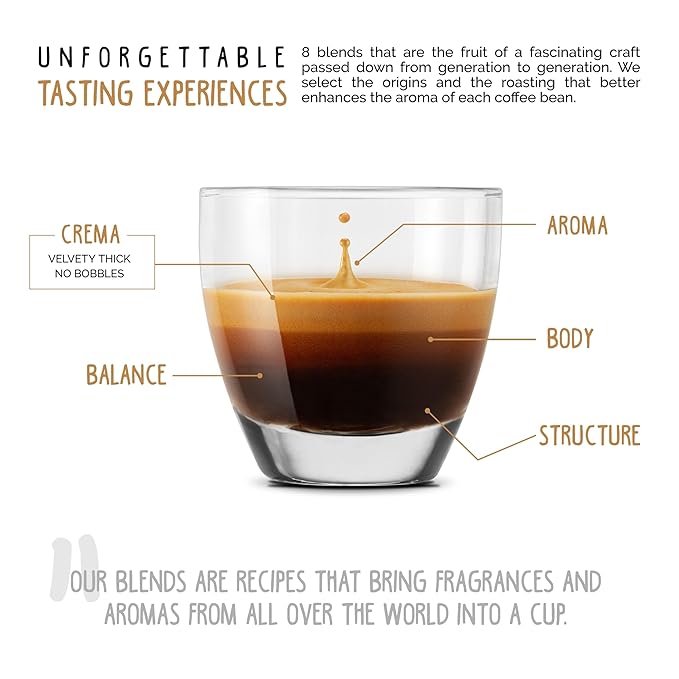 - Rich and Aromatic Flavor Profile: Our Espresso blend boasts a balanced intensity of 7/10, offering a rich and full-bodied coffee experience. The harmonious blend of Arabica and Robusta beans creates a robust and fragrant cup, featuring notes of chocolate, caramel, and nuts, complemented by a subtle spicy flavor that adds depth and complexity to each sip.
