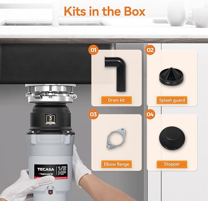 - IN THE BOX: Garbage disposal 1/2 hp with pre-installed power cord, stopper, stainless steel flange assembly, elbow flange, and drain kit.