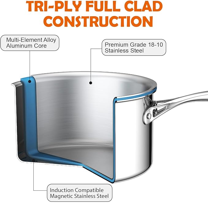 - Multi-Ply Clad: This saucepan features a combination of 18/10 stainless steel with multi-element aluminum core creates a permanent bond of metal, so heat pass through the whole pan body from bottom to side wall, not just bottom