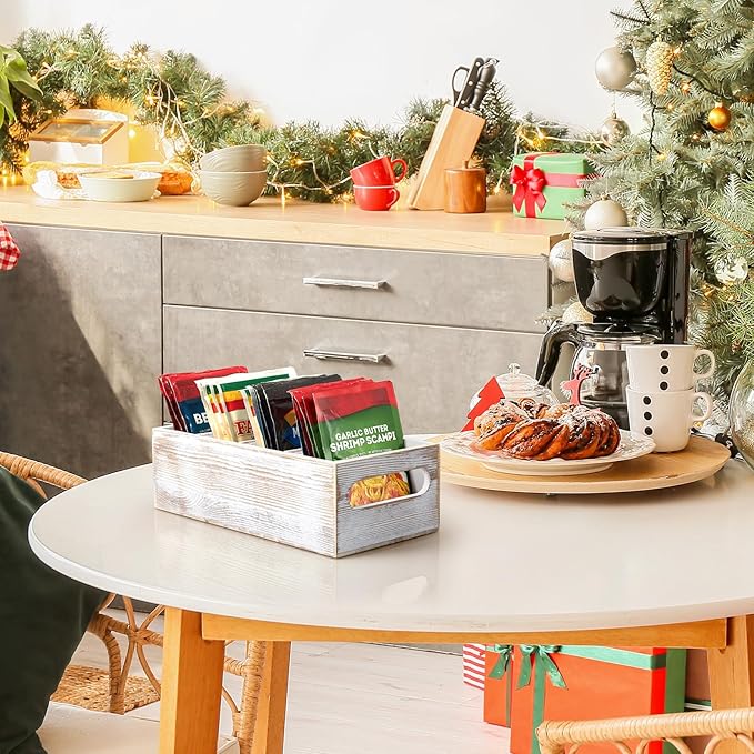 DRASTAR Pantry Organization and Storage Bins, Wooden Seasoning Packet Organizer with Removable Dividers, Retro White Storage Caddy for Kitchen, Pantry, Cabinet, Countertop