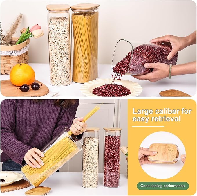- Elegant and Practical Design: Elevate your kitchen organization with the sleek, square design of our Glass Food Storage Jars. These jars aren't just functional – they're also a stylish addition to your countertop or pantry. The clear glass allows you to easily identify the contents, making meal prep and cooking a breeze.
