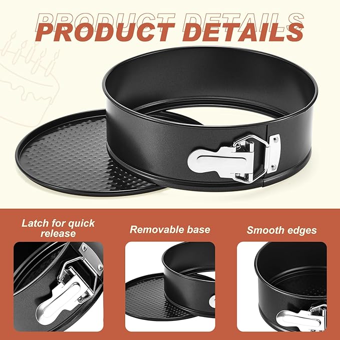 - Stainless Steel Spring Buckles Design: the stainless steel spring buckles of this cake pan round have been upgraded, which are more sturdy and easier to switch, but will not fall off or break, making it easy to pull the cake out nicely