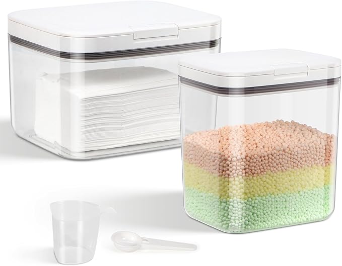 - Large Capacity: The laundry pods container set offers generous storage solutions with 68 oz and 95 oz capacities. Excellent for holding large quantities of laundry powder, dishwasher pods, dryer sheets, or other laundry essentials. Plus, each laundry powder container comes with a handy measuring cup, making it easier than ever to scoop out the right amount of detergent or liquid
