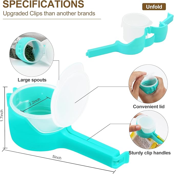 - Versatile Clips: Set of 6 reusable plastic clips with pour spouts for sealing and storing food bags, snacks, pet food, and more.