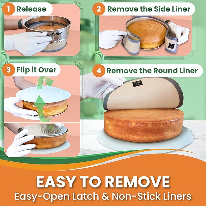 - EASY CAKE REMOVAL – The food-grade silicone liner provides a smooth, reusable non-stick surface, ELIMINATING THE NEED FOR PARCHMENT PAPER or sprays. UNLOCK THE LATCH, and your cake will release easily, perfectly round, and flawless—thanks to the 9 in spring form pan for cheesecake design!