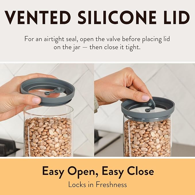 - Exclusive Vent Design Locks in Freshness: A proprietary venting design on the silicone cover locks in freshness; Simply “pop” open the valve before placing the lids on your canisters and close valve to store pasta, snacks and flour without moisture
