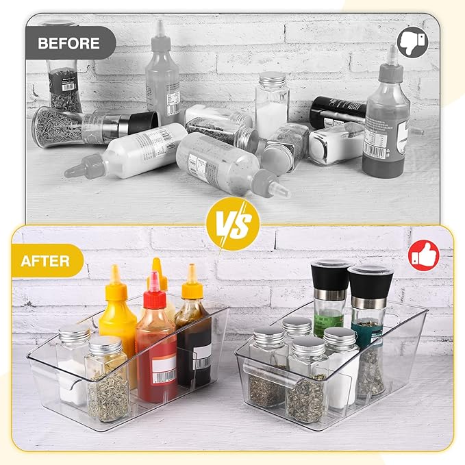 - Removable Dividers:There are 3 removable dividers in each food storage organizer bin, making it easy to separate and organize your items, you can quickly see and grab what you need.Pantry organizer bins will be a good choice as organizer bins to store and organize medicine, snack, spice packets,seasoning packets, tea packets, instant food packets