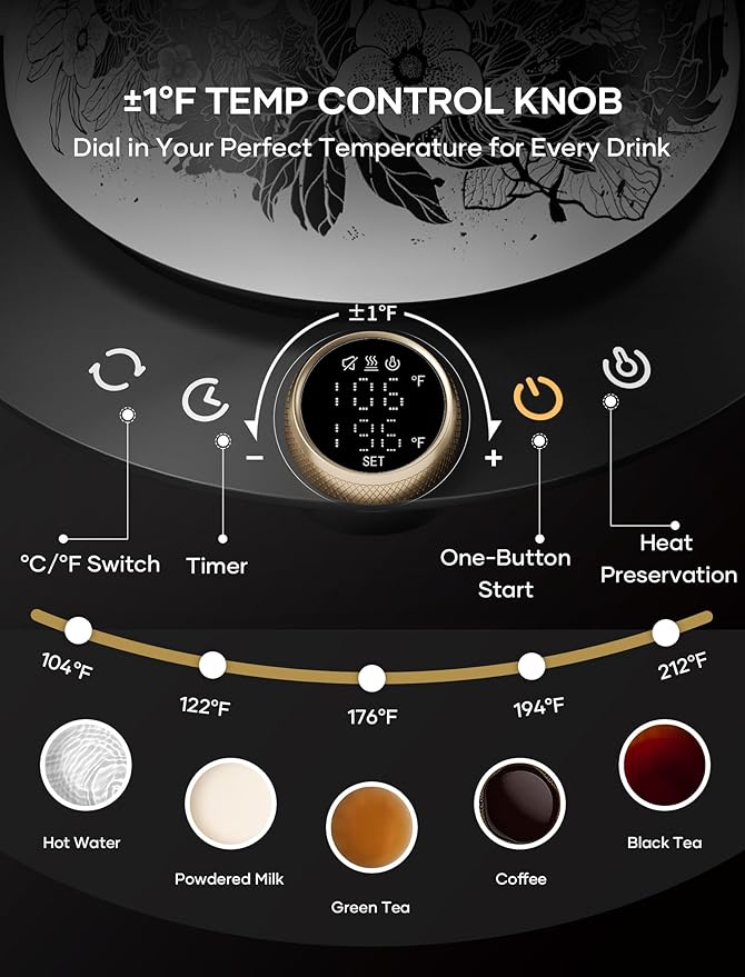 - ±1°F Precision Control: Brew with confidence using barista-level temperature accuracy. The smart base holds water within ±1°F for flawless extraction.
