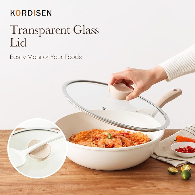 Nonstick Wok with Lid, 12 Inch Woks & Stir-fry Pans, Healthy Coating Induction Cookware, Compatible with All Stovetops, PFOA Free (Cream White)
