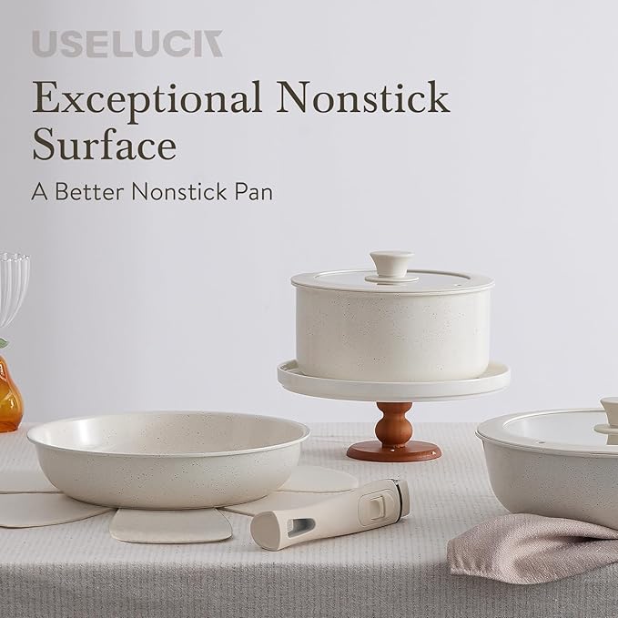- 【Detachable Handle Cookware for Easy Storage】Our cookware with removable handles offers great convenience, allowing for compact storage. Whether you're at home or on the go, this detachable handle pots and pans set is easy to store in cabinets or RVs. The unique locking system ensures nonstick detachable pans stay securely in place