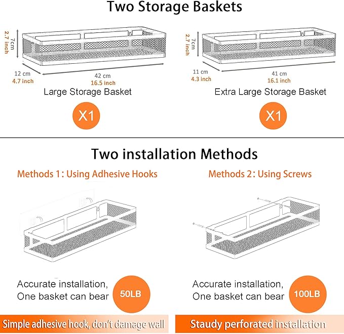 - Included Components : 2 baskets, 2 traceless sticker, 4 hooks, 4 screws, 4 wall stoppers