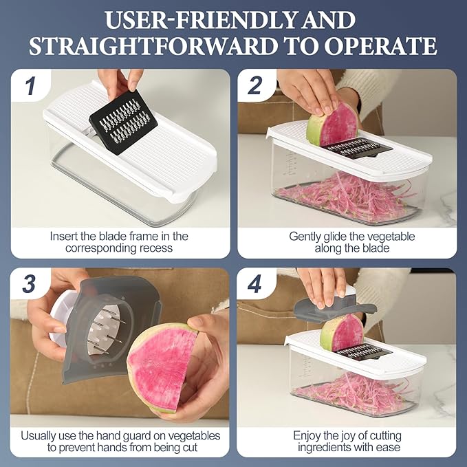 - An innovative mandolin slicer that will make you addicted to chopping: It is equipped with 6 interchangeable razor-sharp blades for effortless ingredient preparation. The expanded hand guard ensures the safety of your fingers, while its detachable design facilitates easy cleaning. The food collect container of the vegetable slicer features a scale for precise measurement of ingredients, and has been reinforced to enhance overall durability