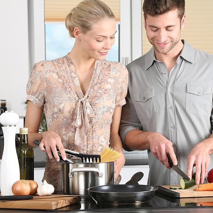 - Thoughtful Design for Convenience:The upgraded pasta tongs feature a serrated head design, making it effortless to grip noodles without slipping. Equipped with a detachable stand, the tongs can rest upright on your counter, keeping your your workspace clean. Built with ultra-thick, rust-resistant 430 stainless steel, these tongs are sturdy and versatile, perfect for handling not just pasta but also other foods.