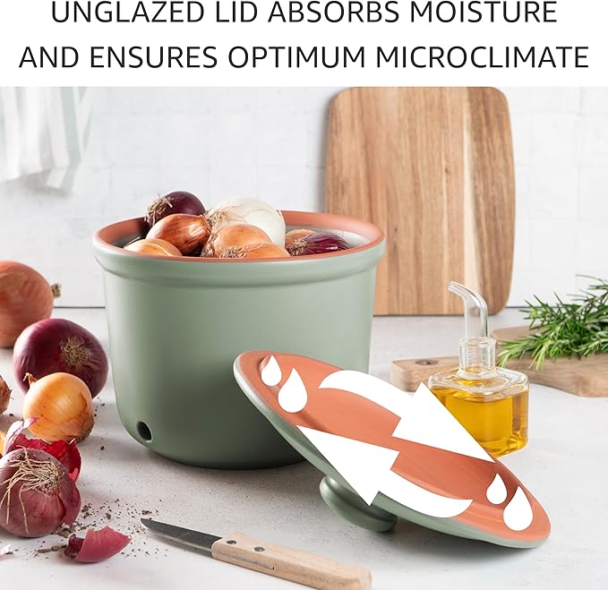 - Includes a Maxi Plus pot for potatoes (5.8 qt), a Maxi pot for onions (2.9 qt), and a Mini pot for garlic (0.6 qt).