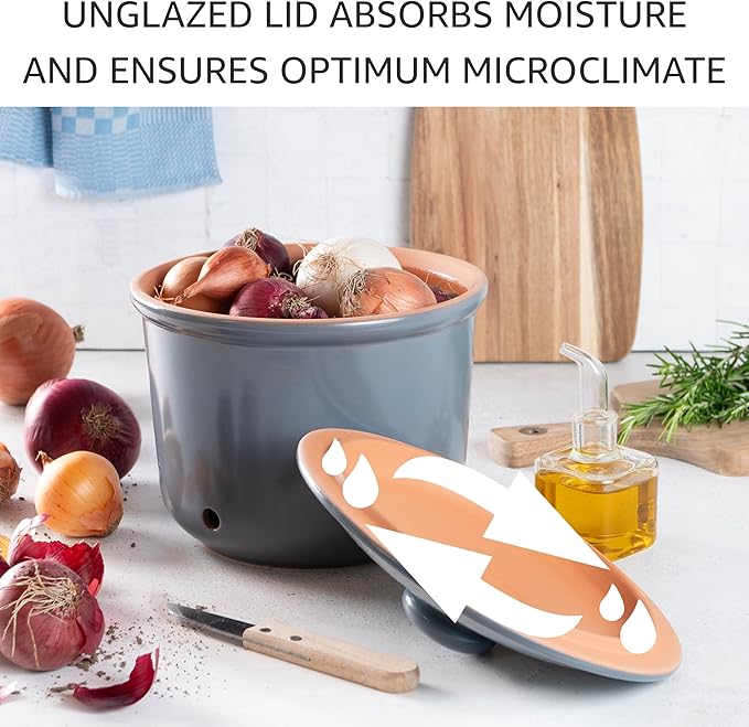 - Includes a Maxi Plus pot for potatoes (5.8 qt), a Maxi pot for onions (2.9 qt), and a Mini pot for garlic (0.6 qt).