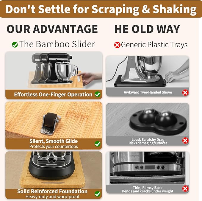 - SOLID BAMBOO ROLLING TRAY | Unlike flimsy plastic competitors, this heavy-duty appliance sliding tray is crafted from solid, multi-layered bamboo. Lab-tested to support a 40lb stand mixer or Vitamix without flexing, it provides an unshakable, wobble-free foundation on your kitchen countertop.