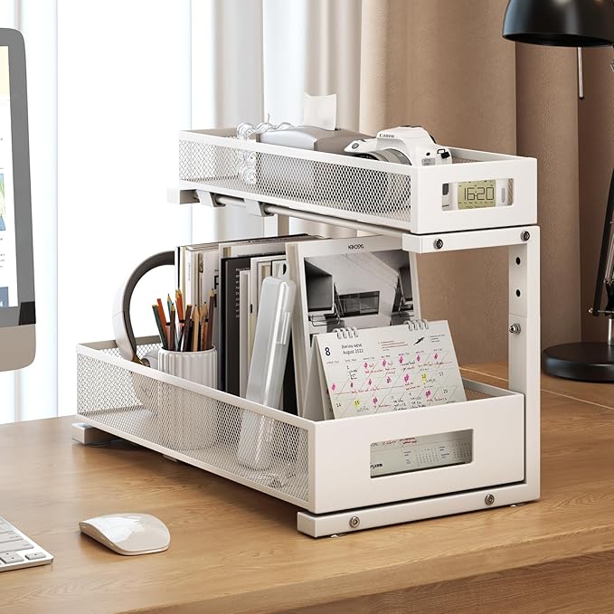- 【2-Tier Pull-Out Design for Easy Access】This under-sink organizer features a double-layer pull-out design, allowing you to easily access items at the deepest part. The upgraded, thickened iron circular sliding rails ensure a smooth and seamless pulling experience, making each use effortless. The unique pull-out locking mechanism effectively prevents the drawers from being completely pulled out, avoiding the risk of items falling or structural damage caused by over-pulling, ensuring safer and more convenient use.