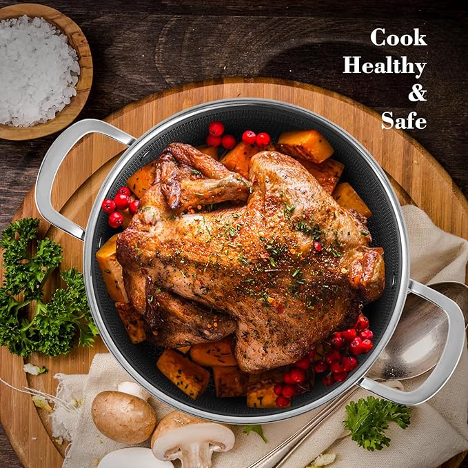 - 【Energy-Saving TriPly Performance:】Aluminum core heats 2x faster and retains heat longer, reducing cooking time and energy use. Even heat distribution ensures perfect browning with 30% less oil. Stainless steel cools quickly for safer handling, while warp-resistant bases guarantee long-term reliability.