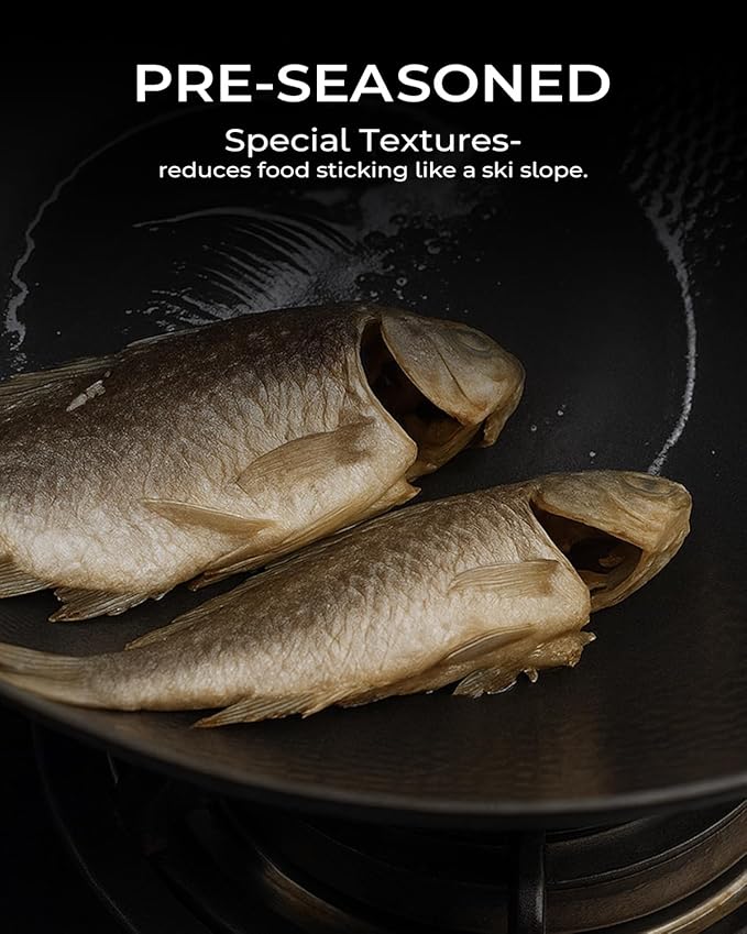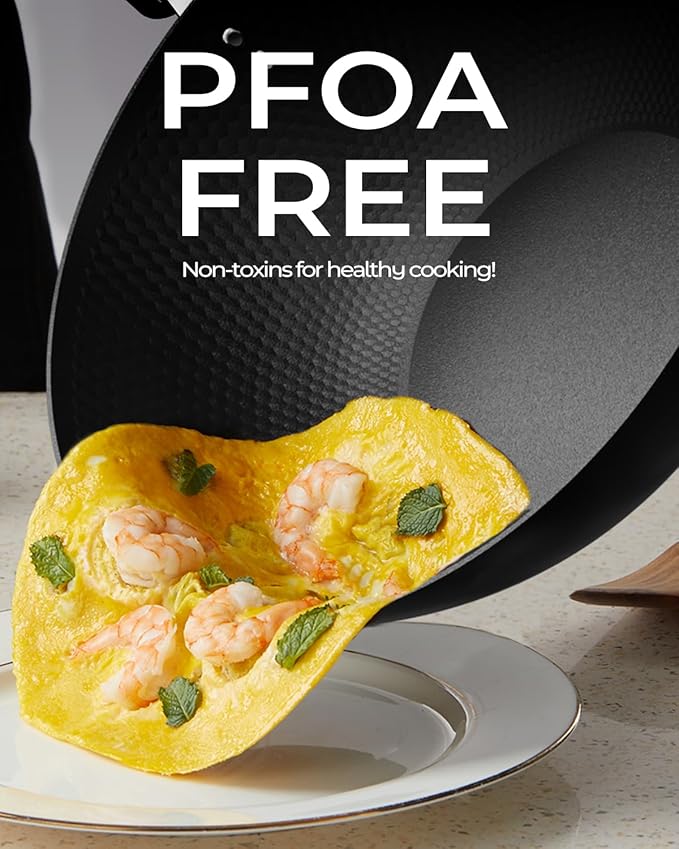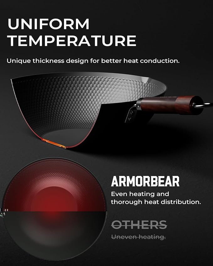 - Pre-Seasoned & Naturally Nonstick: Armorbear wok is made from high-quality carbon steel, ensuring durability. Pre-seasoned and ready to use right out of the box. Featuring a well designed textured surface that resembles a ski slope, this stir-fry pan minimizes food sticking. With proper seasoning, you can easily achieve a natural non-stick finish. NO COATINGS, NO PFOA and NON-TOXIC.
