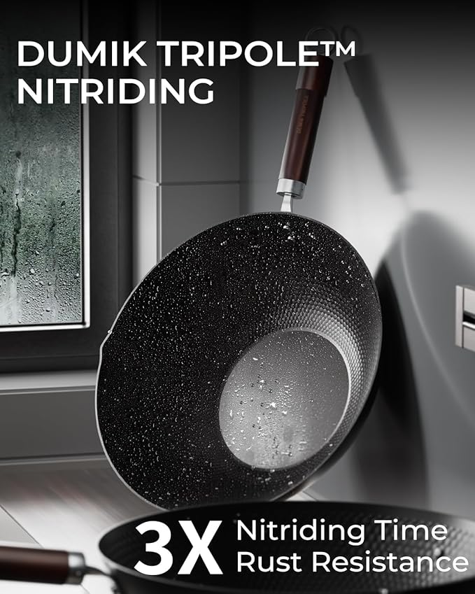 - DUMIK TRIPOLE Nitriding: This wok features advanced nitriding technology from Japan (not made in Japan). With a triple-long nitriding process, it boasts superior strength, exceptional abrasion resistance, and three times rust protection. Even after the rigorous 72-hour corrosion test, it remains as clean as new.
