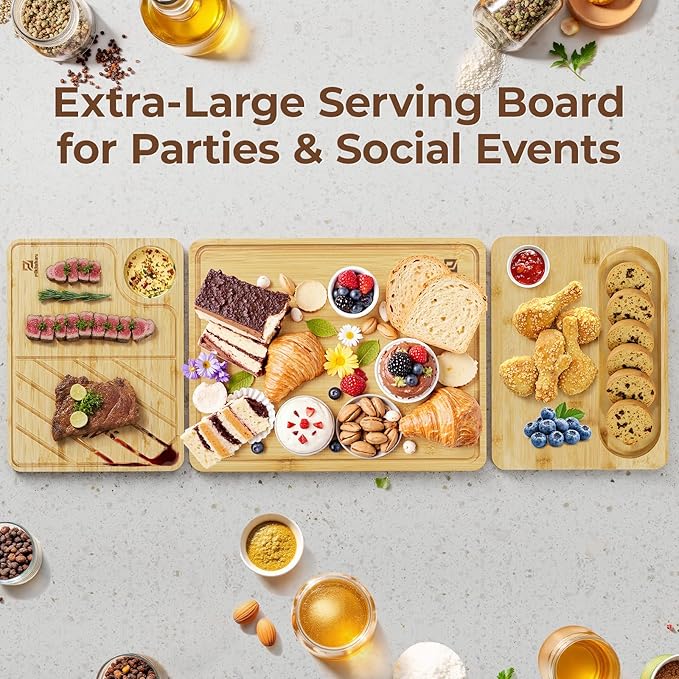 - Versatile Bamboo Cutting Board Set with Stand: This set includes one XL board (17"x13") for meats, pizza and two large boards (13"x10") for steak, cheese, fruit, vegetable. These premium bamboo boards handle all your daily cutting tasks while doubling as serving trays
