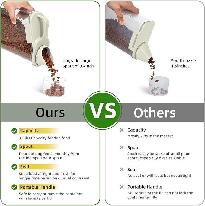 - Upgraded and Lmproved Versions:We have optimized and improved the mold the pour spout is large enough to pour out the big dog Food,You can pour out the food easy and fast now. The new upgraded Measuring Cup is also easy to screw on the spout now.The lid with snaps can also be easily closed on the barrel body.
