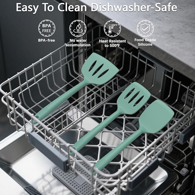 - [Easy to Clean & Dishwasher Safe]: The non-stick silicone surface makes cleanup a breeze, and all utensils are dishwasher-safe for added convenience. With top hanging holes and the included storage holder, organizing and storing your utensils is easier than ever