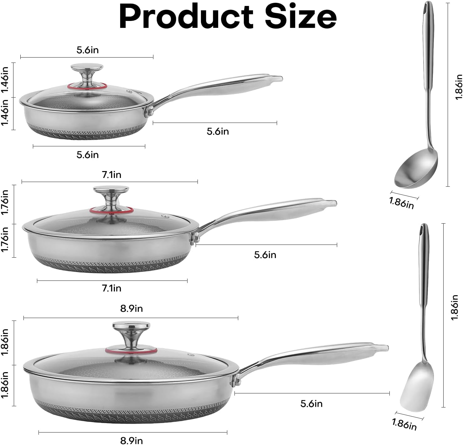 - 8 Piece Pots and Pans Set Includes -18/10 Stainless steel 8 inch frying pan / 10 inch frying pan/ 12 inch frying pan,all with lid.2 PCS utensils(Ladle,Spatula),free of intentionally added PFOA, PTFE, PFAS, PFOS.