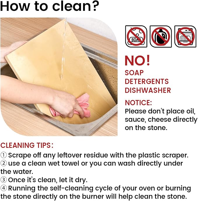 - Cleaning is a breeze with our grilling stone. Once cooled, simply use a cloth and scraper with warm water—no detergent needed. Remember, DO NOT season the cordierite stone with oil or grease, ensuring it stays in top condition for countless delicious bakes.