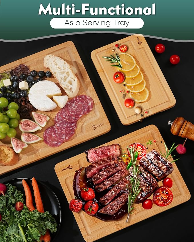 - Anti-slip design and outstanding craftsmanship: Our bamboo cutting boards feature excellent anti-slip performance, with anti-slip rubber feet to ensure stability on any countertop, providing a safe and efficient cutting experience. The meticulous craftsmanship extends to every detail. The bamboo chopping board features carefully rounded edges, a comfortable grip and structure, maintaining its shape and plane over time.