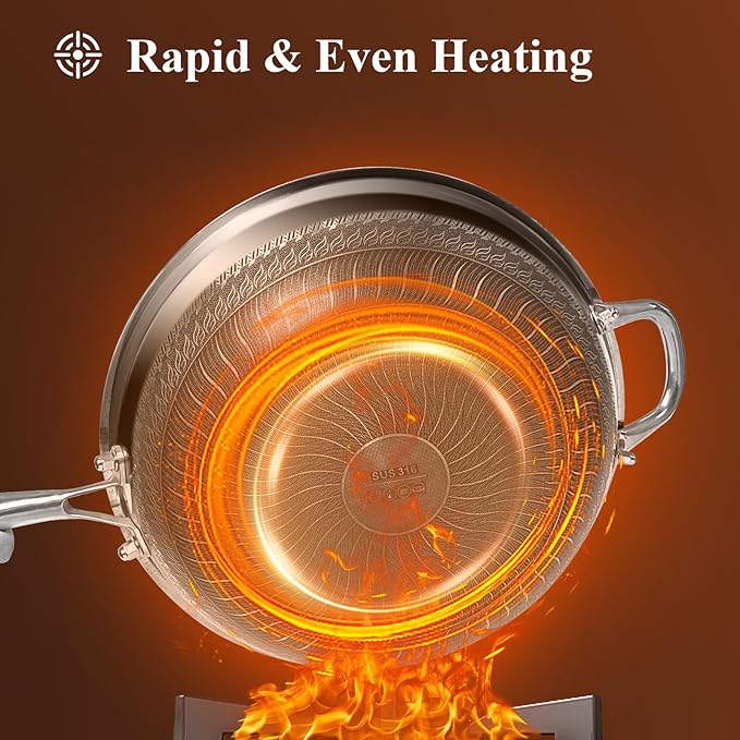 - 【Advanced Honeycomb Nonstick Technology】Experience unparalleled cooking efficiency in this professional wok pan, featuring laser-etched honeycomb technology that creates millions of micro-air cushions. This innovative stainless steel pan surface actively repels food particles while requiring 70% less oil than conventional pans, delivering stick-resistant perfection that withstands metal utensils and maintains flawless performance through years of high-heat searing and tossing