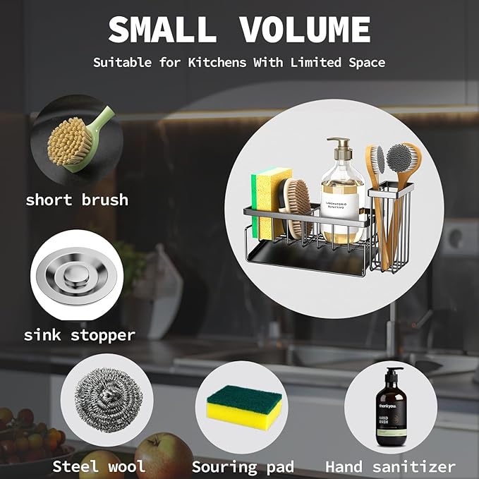 - 【Space-Saving Kitchen Counter Organizer for Small Sinks – Fits 8” Narrow Spaces!】Compact 8.27x3.74-inch footprint fits RVs, apartment kitchens, and cluttered countertops. Vertical storage design holds 1 large dish soap bottle, 2 sponges, and a scrub brush without blocking faucet access – ideal as a rental-friendly sink caddy or under-cabinet storage solution