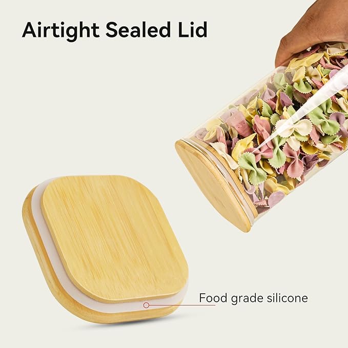 - 【Airtight Sealed Lid】: Bamboo lid with silicone ring creates an airtight seal — locking out air to preserve freshness. Food stays protected from moisture, keeping dry ingredients(like flour and sugar) fresher for longer and snacks (like cookies and candies) perfectly crunchy and flavorful. Never worry about things getting stale again!