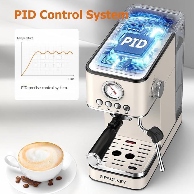 - 20 BAR PROFESSIONAL PUMP: 1200w espresso maker is equipped with 20 bar professional Italian pump, and SPACEKEY espresso machine has a smart pre-soak system, so that the ground coffee powder in the full pressure extraction before the low pressure delivery of water to moisten a more uniform extraction, and the PID intelligent control of water temperature, so that your espresso more delicious.