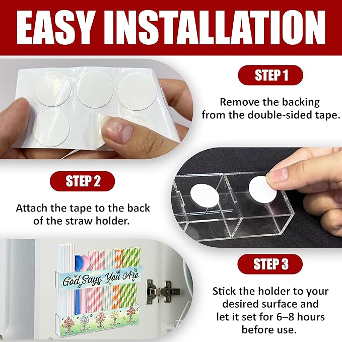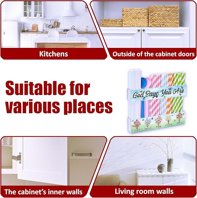 - 2-Piece Adjustable Design for Flexible Storage: Features top (7.9 x 1.57 x 0.98 in) and bottom (7.9 x 1.97 x 0.98 in) panels to fit various straw lengths. Includes 10 strong double-sided adhesive pads for secure, drill-free mounting on cabinet doors or walls.