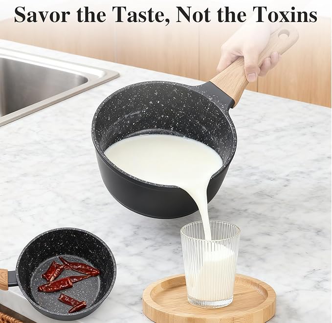 - 【The Perfect Pan for Eggs & The Ideal Pot for Sauces】 This set is designed for real-world cooking. The 8.5-inch frying pan is your ultimate egg pan, ensuring flawless omelets and pancakes. The 1.43QT saucepan with lid is ideal for simmering sauces, boiling oatmeal, or heating soups—covering all your daily essentials.