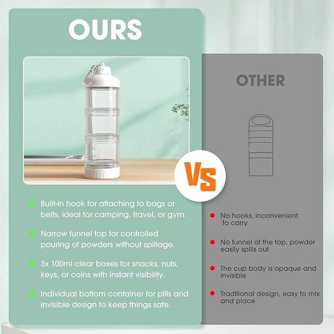 - Multipurpose Use and Convenient Design: more than just a protein powder dispenser, this versatile protein powder holder can be applied for a variety of powder types, not solely limited to dietary supplements; The integrated funnels on the lid enable you to pour out the powder smoothly and easily into any other container, reducing spills and wastage; The hiking buckle makes it easy to carry your container on your backpack; the individual bottom containers makes it easy to put pills or other small items.