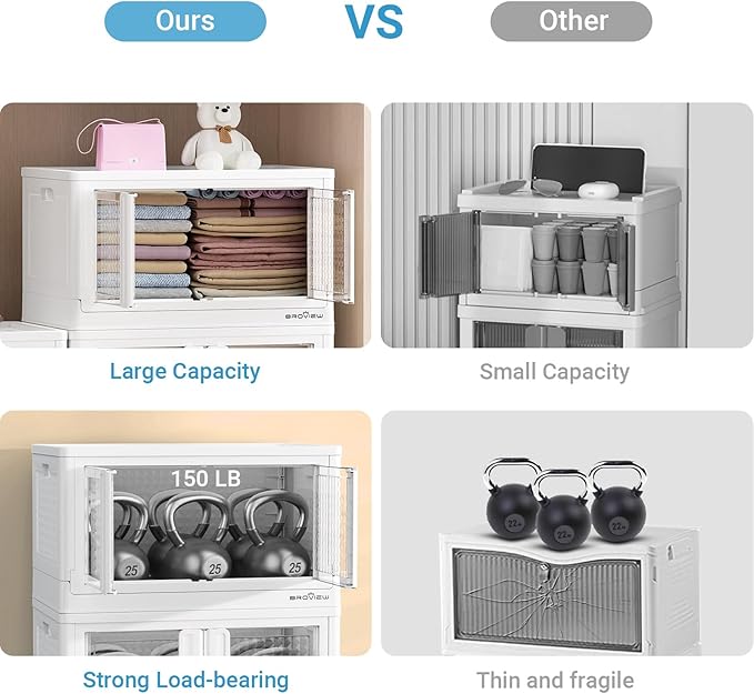 - 【Space-Saving Stackable & Collapsible】Maximize your storage footprint. Stack bins vertically as modular cabinets (bedside, clothing, books, kitchen) and collapse them nearly flat when not in use. Perfect for closets, laundry rooms, garages, playrooms, classrooms, dorms, and car trunks – featuring a roomy, odorless design.