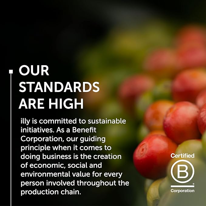 - Certified B Corp: illy is committed to sustainable initiatives, as the first Italian coffee company awarded a B Corp Certification, we strive to create positive economic, social, and environmental value for everyone involved in the production chain.