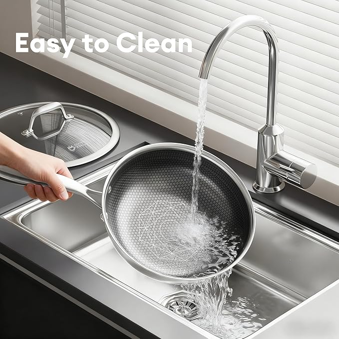 - 【Healthy Cooking & Easy Cleaning】Our stainless steel wok uses an all-natural, non-toxic ceramic coating to prevent food from sticking, and it can be cleaned easily with metal utensils. Simply rinse with water. It is dishwasher-safe for hassle-free cleaning