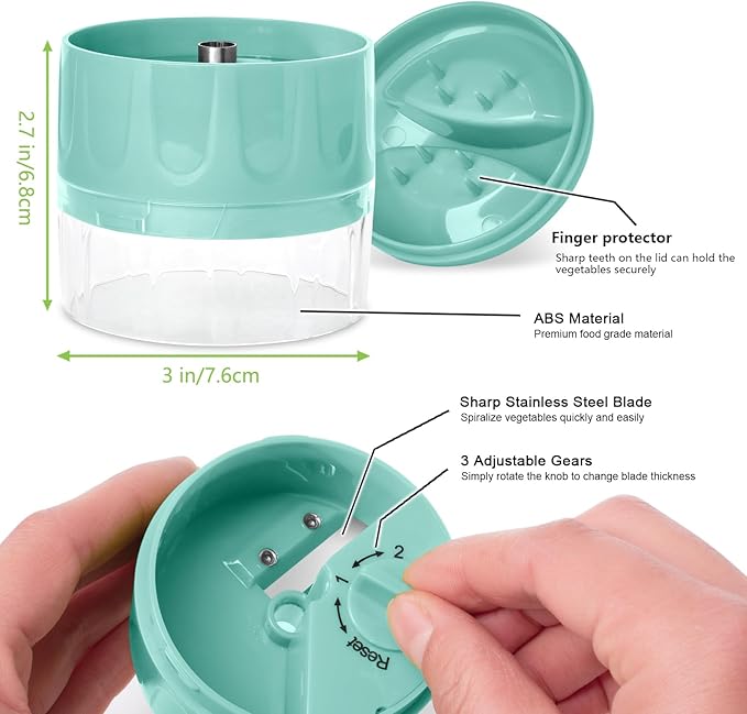- HIGH QUALITY MATERIALS-The blade of spiralizer is made of high quality stainless steel. Due to its compact size, it takes up minimal space and fits comfortably in the hand for precise and safe cutting.