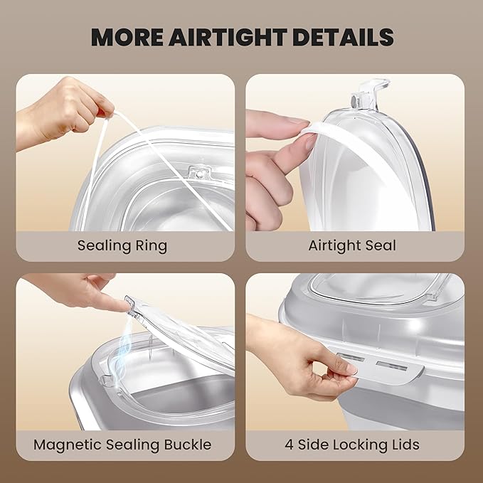 - Transparent Lid: Upgrade design! Our cat food container with transparent lid allowsyou to directly see the remaining quantity of the pet food. Make sure you always knowwhat's left!