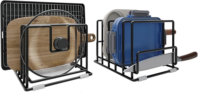 - ใ๐๐๐ซ๐ ๐ ๐๐๐ฉ๐๐๐ข๐ญ๐ฒ & ๐๐๐ซ๐ฌ๐๐ญ๐ข๐ฅ๐ข๐ญ๐ฒใThe 7-slot rack fits at least 7 cutting boards, trays, or up to 10+ thinner pans. The 5-slot lid holder neatly organizes pot lids, keeping them upright, stable, and easy to grab. A must-have for tidy kitchens.