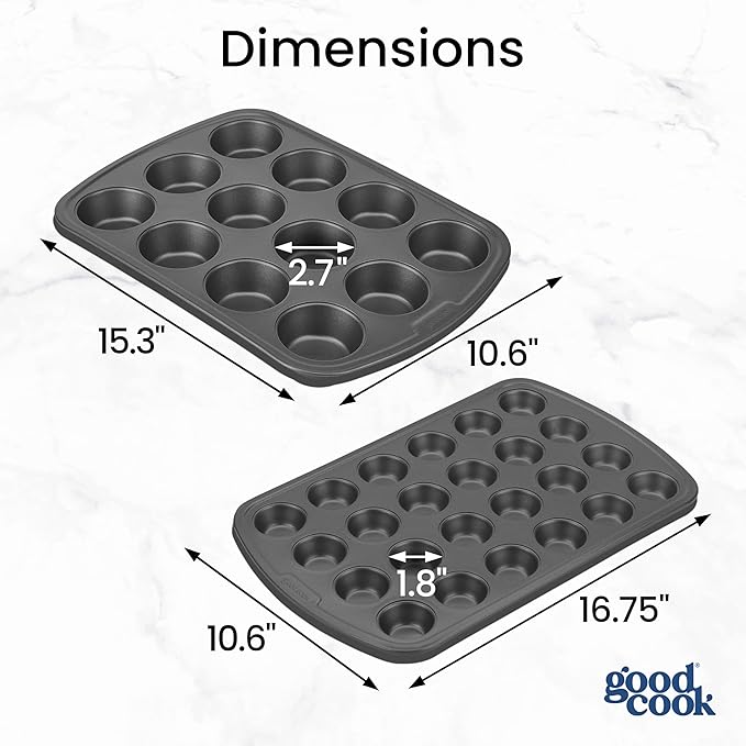 - GoodCook 12-Cup Nonstick Steel Muffin and 24-Cup Nonstick Steel Mini Muffin Pan ensures an ideal bake of you favorite muffin, cupcake, and savory treats recipes